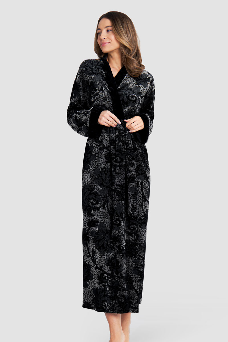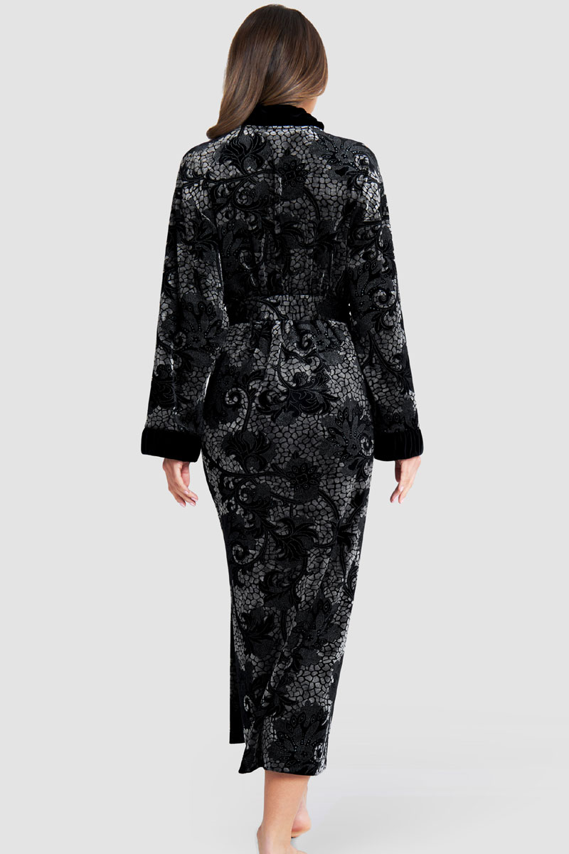 Передняя планка халата, пояс и край рукавов украшены черной бейкой, что придает халату дополнительную изысканность.