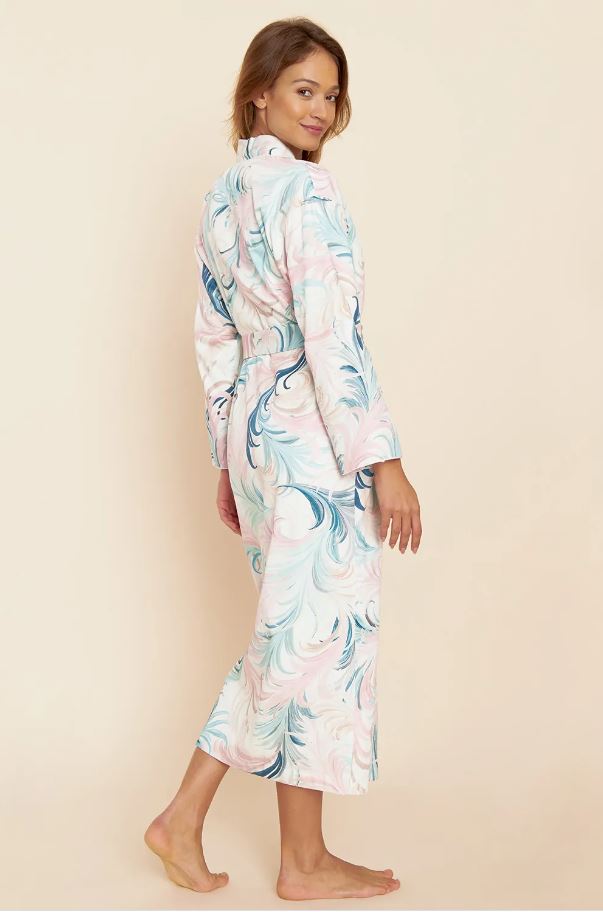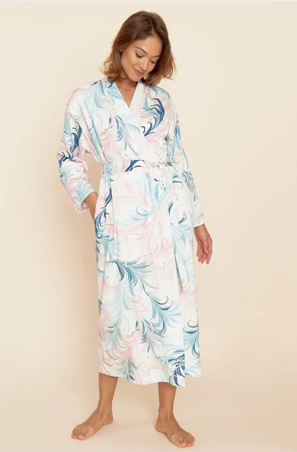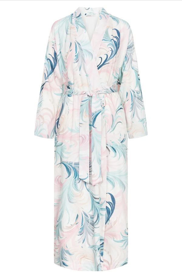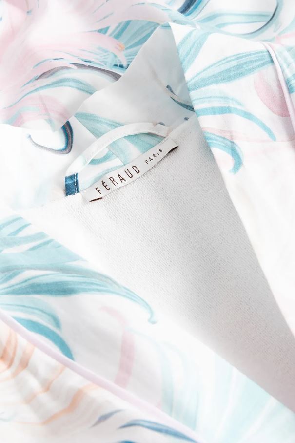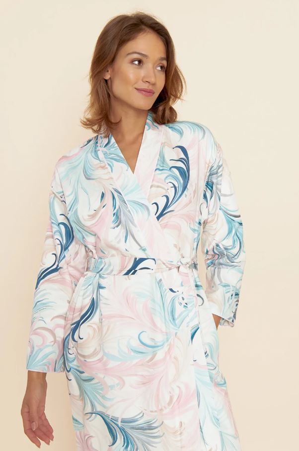 Элегантный халат-кимоно с отделкой и окантовкой из высококачественной ткани из хлопкового атласа и удобной махровой подкладкой с принтом перьев гармоничного цвета. Боковые карманы и пояс на завязках обеспечивают комфорт.