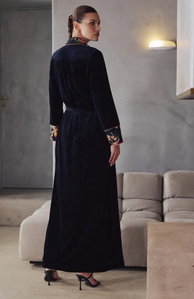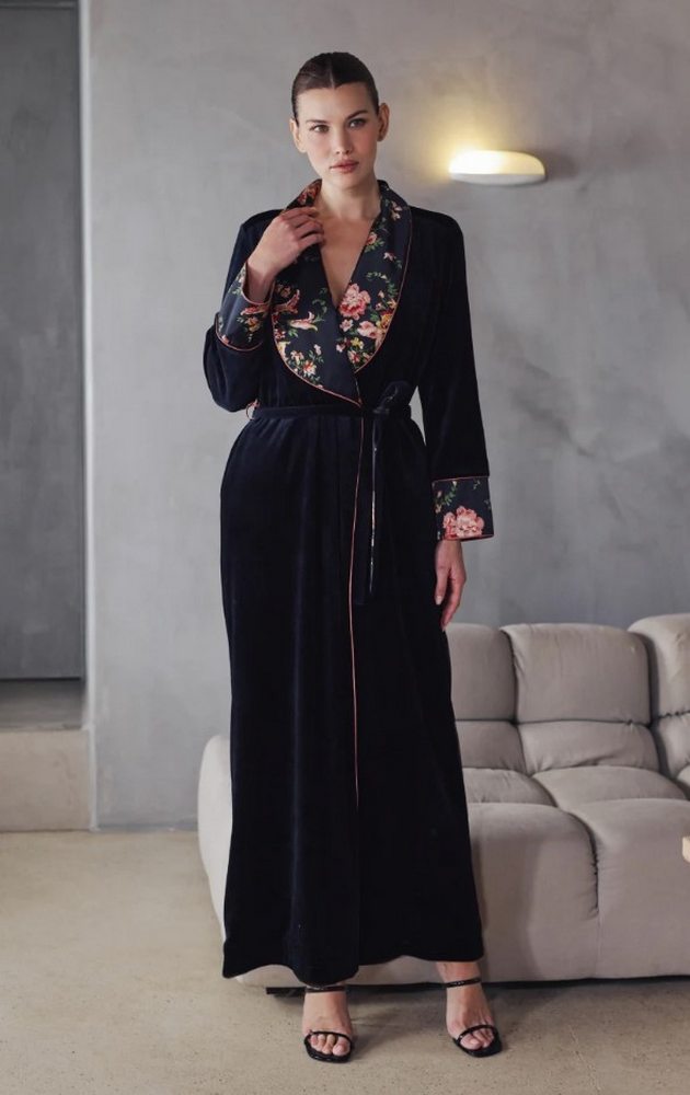 Длинный халат из ультрамягкого черного бархата. Подкладка из атласа с цветочным принтом, эксклюзивная для линии Bernadette. Контрастные манжеты рукавов и воротник-шалка. Длинный завязывающийся пояс. Вшитые карманы для максимального комфорта. Свободный и элегантный крой.