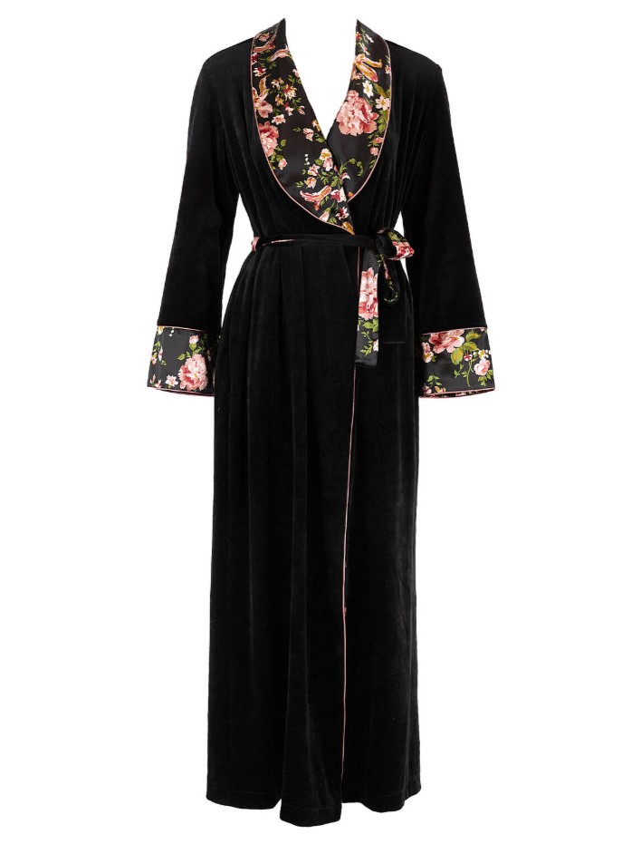 Глубокий чёрный бархат элегантно контрастирует с атласной подкладкой с цветочным рисунком , которая видна на воротнике и рукавах. Пояс в тон подчёркивает талию, создавая изящный силуэт даже в домашней обстановке.