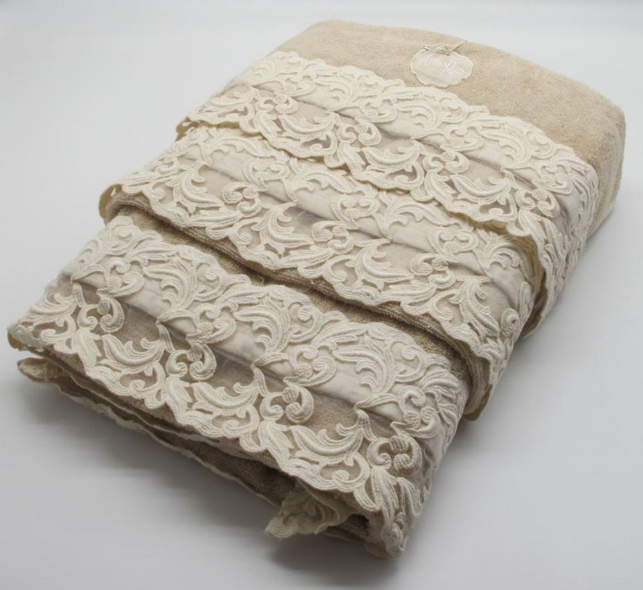 Великолепные комплекты полотенец украшены натуральным кружевом и выполненны в технике «Stone wash» придающей поверхности эффект старения и потертости.