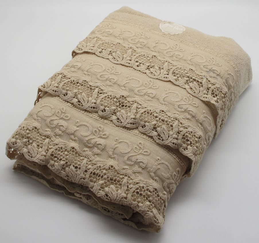 Великолепные комплекты полотенец украшены натуральным кружевом и выполненны в технике «Stone wash» придающей поверхности эффект старения и потертости.