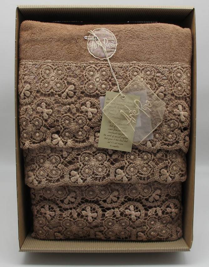Великолепные комплекты полотенец украшены натуральным кружевом и выполненны в технике «Stone wash» придающей поверхности эффект старения и потертости.