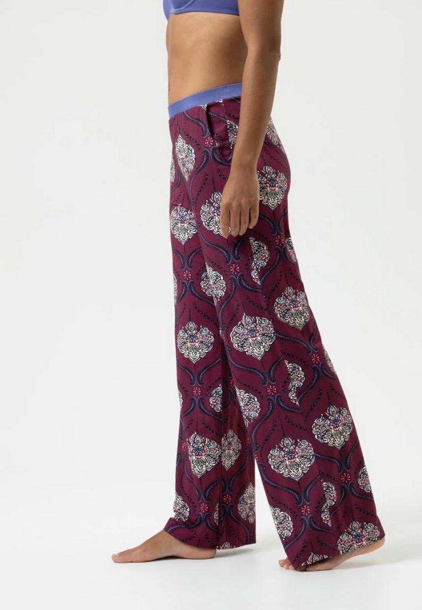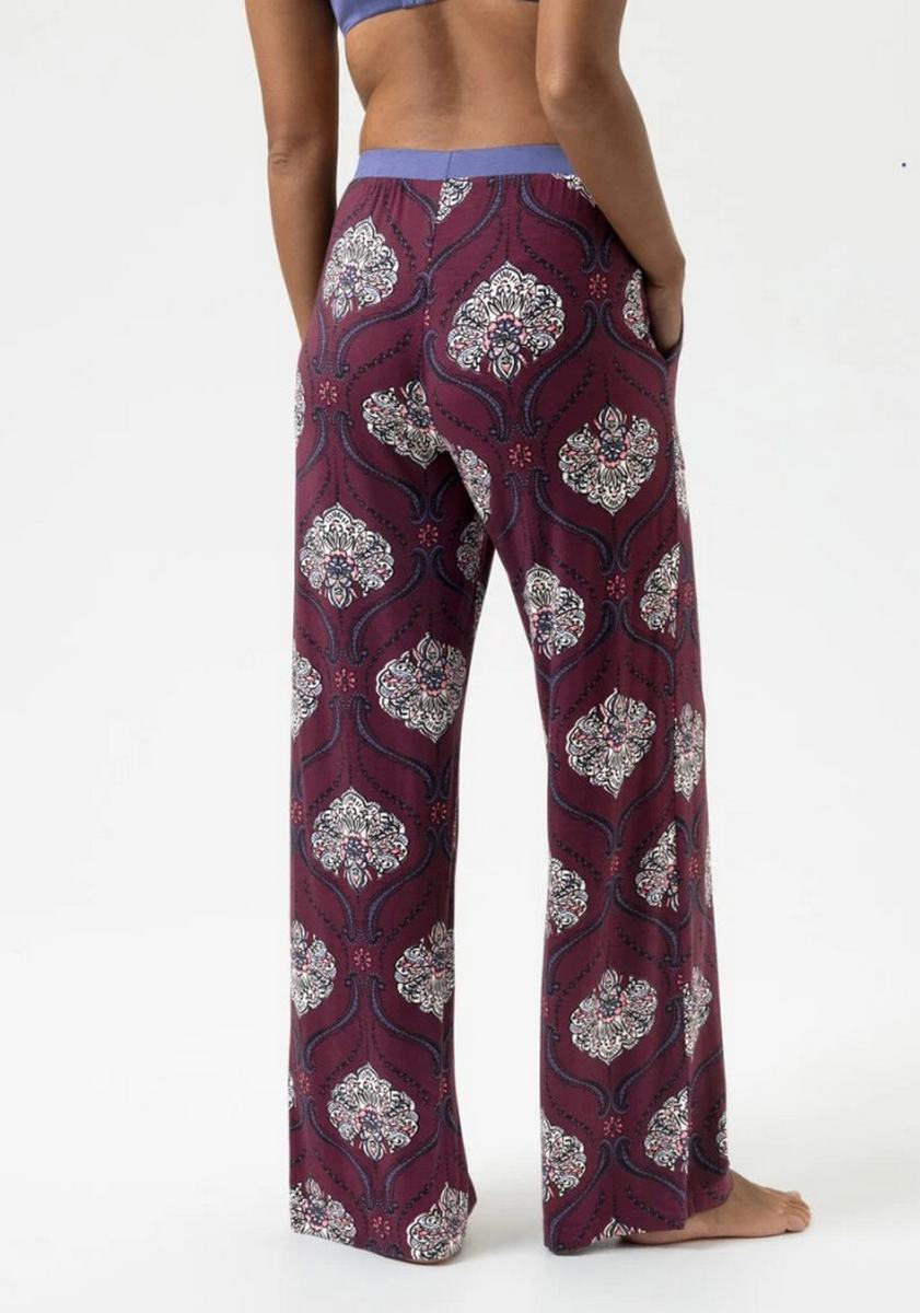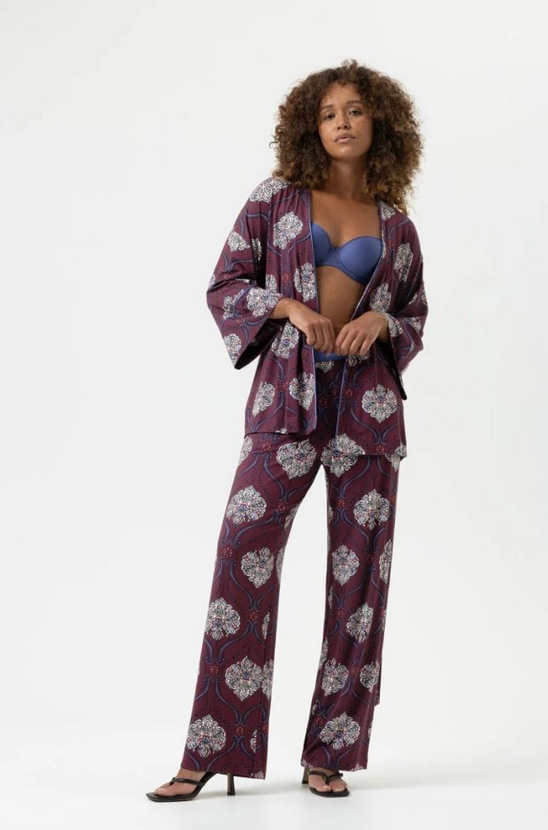 Роскошное кимоно из серии «Загадочные украшения». Основной принт - крупный орнамент. Ручная роспись и необычная игра цветов. Цвет тёмно-бордовый. Рукава длиной 3/4. Широкие брюки с боковыми карманами и атласным поясом. Сделано в Германии.