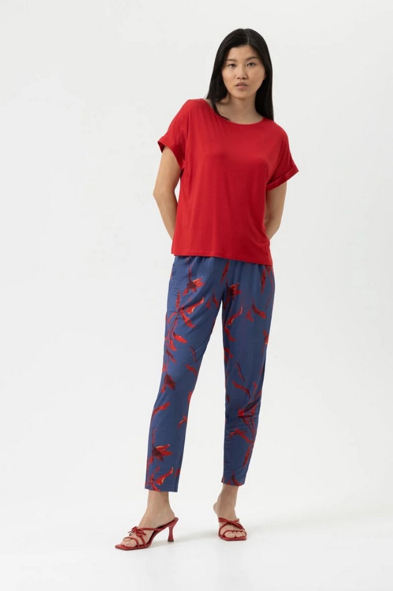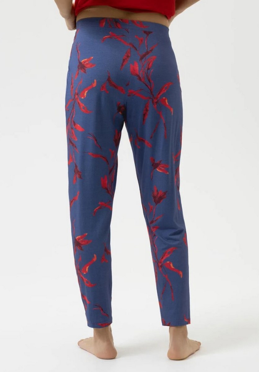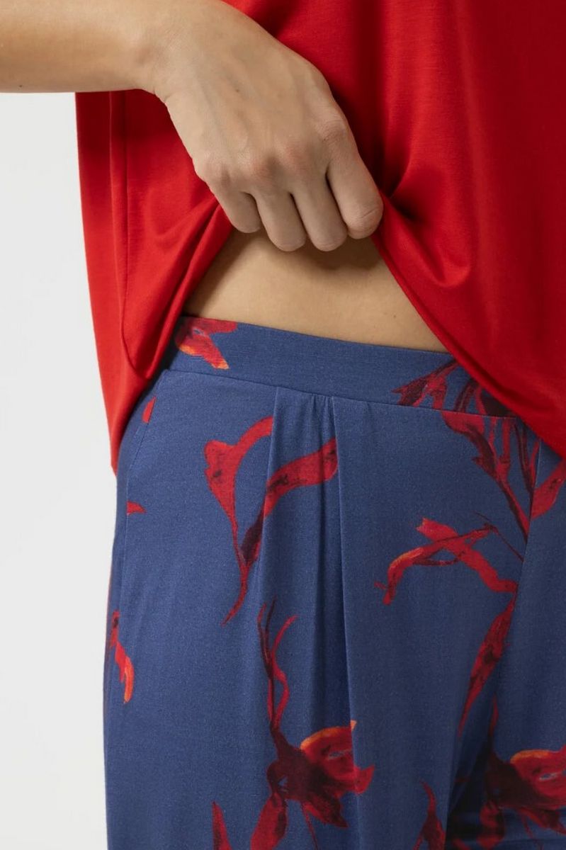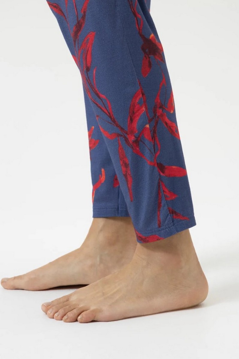Брюки до щиколотки в цвете Astral Night из коллекции Royal Garden. Королевский сад очаровывает расписанными вручную красными листьями, которые сияют, словно языки пламени, на глубоком синем фоне. Нежная красная атласная окантовка и изысканный двухцветный дизайн создают уникальное сочетание материалов.