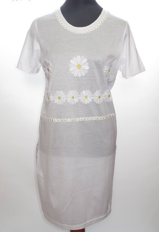 Классическая сорочка из белого трикотажного хлопка с коротким рукавом. Украшена аппликациями ромашек. Длина 93 см. 100 % хлопок.