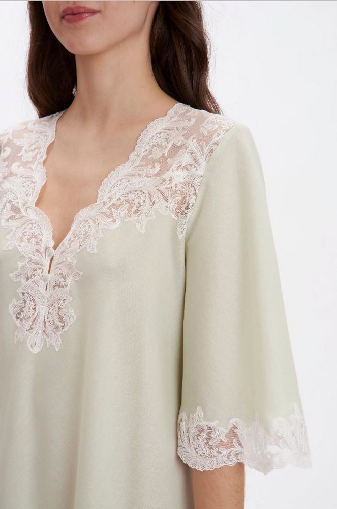 Ночная рубашка Flora Lastraioli цвета зеленого яблока из великолепного итальянского хлопка выполнена полностью вручную в ателье Flora Lastraioli. На передней части изделия и на рукавах – великолепное флорентийское кружево