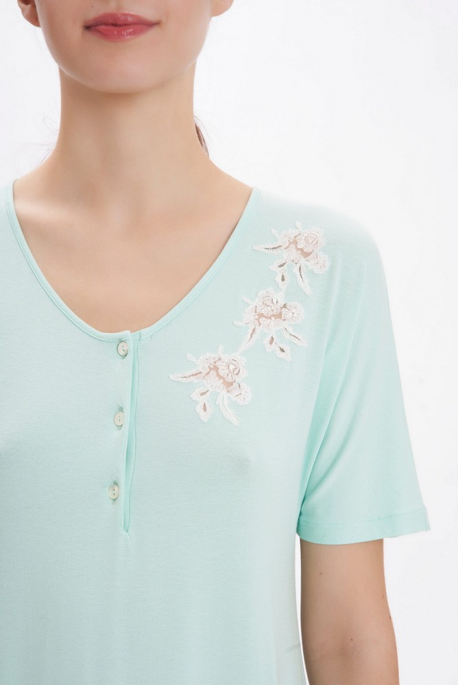 Трикотажная ночная рубашка VERA 5455 цвета тиффани от Flora Lastraioli украшена на груди кружевом с флористическим узором, полностью ручная работа в ателье Flora Lastraioli.