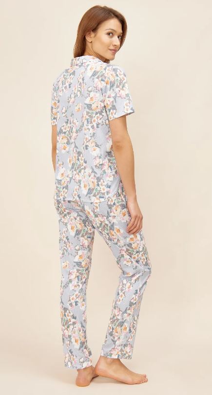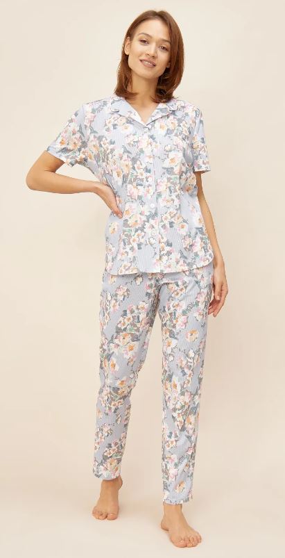 Классическая оригинальная женская пижама на пуговицах с короткими рукавами и лацканами с декоративным цветочным принтом на тонких полосках из удобного хлопкового трикотажа. Аккуратный акцент окантовки на переднем плече и закругленный верхний воротник.