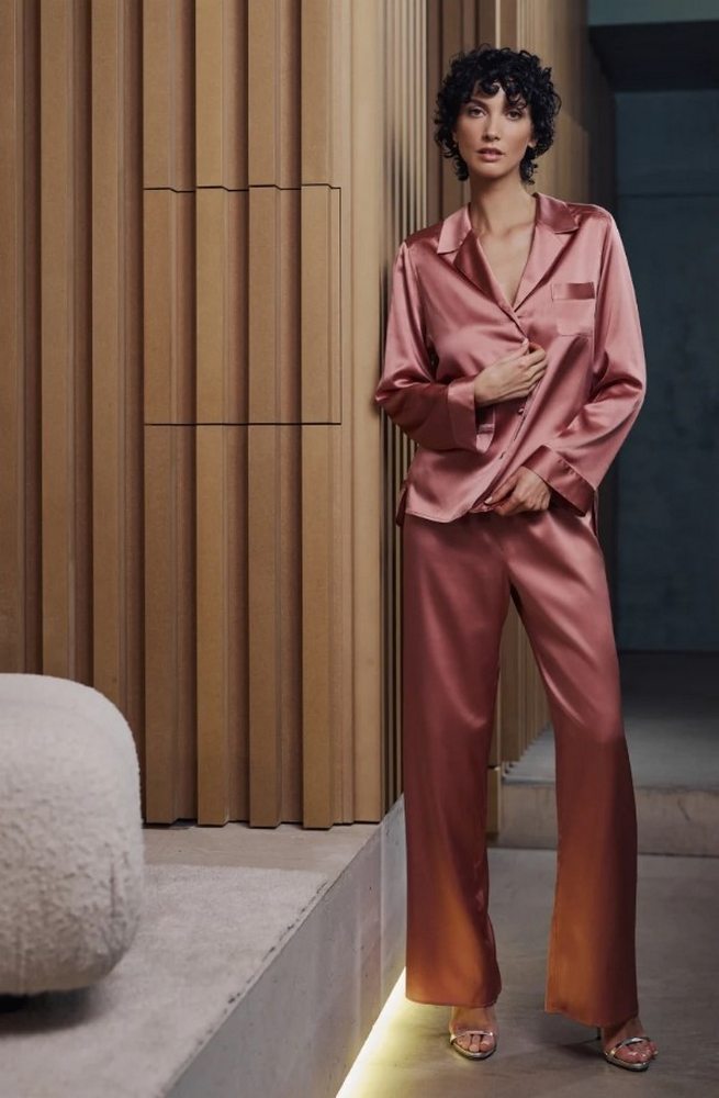 Комплект из двух предметов: рубашка с длинными рукавами и брюки прямого кроя. Ультрамягкий атлас с добавлением шелка. Застежка на пуговицы в тон на рубашке. Удобные брюки на эластичном поясе. Струящийся крой и безупречная драпировка. Элегантная отделка и незаметные швы.