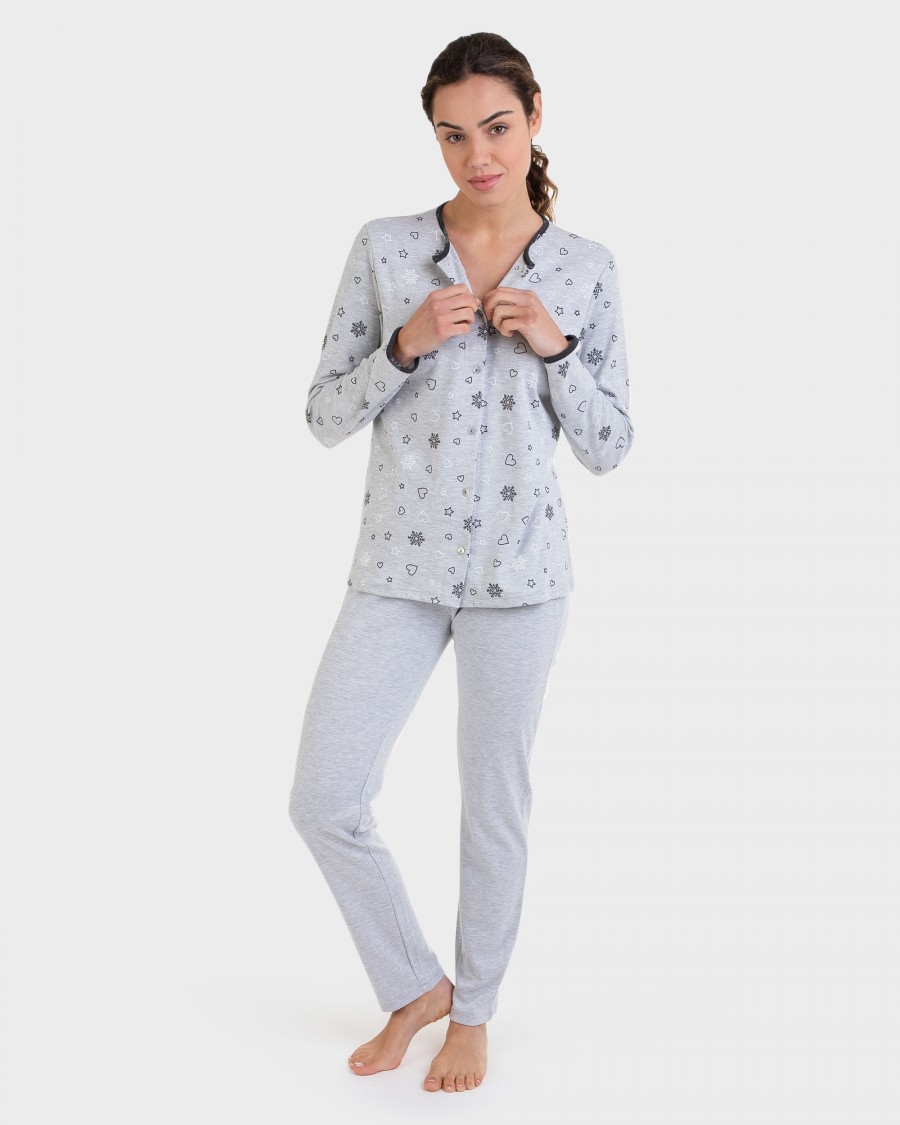 Женская оригинальная пижама-костюм. Верх серый на пуговицах, с длинным рукавом. Рисунок. Серые брюки. Материал: 50% хлопок, 50% полиэстер.