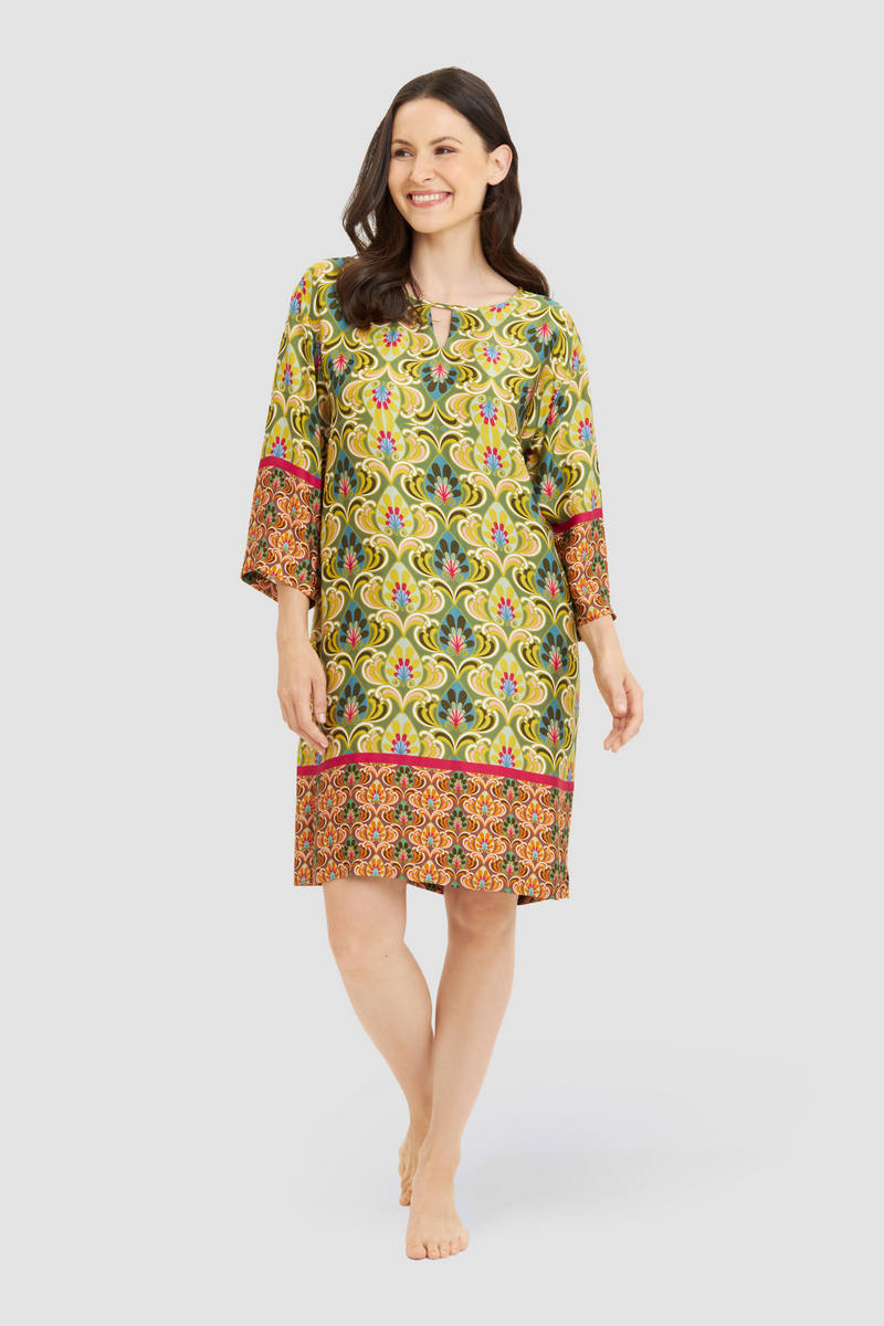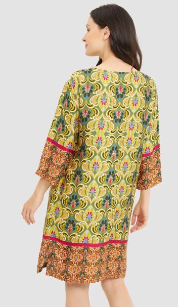 Платье из вискозного атласа с рукавами 3/4 и орнаментальным узором, дополненным контрастной каймой по подолу и манжетам рукавов. Круглый вырез горловины подчеркнут небольшим разрезом, а практичные карманы завершают дизайн.