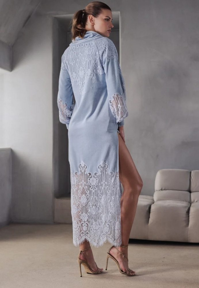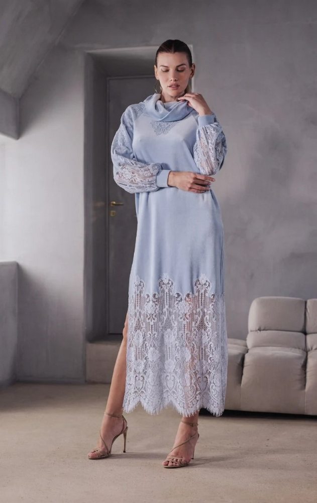 Платье из мягкого бархата выделяется облегающим шалевым воротником и рукавами-буфами из кружева, которое тонко играет с прозрачностью. Но именно в нижней части платья его очарование раскрывается в полной мере: эффектная вставка из цветочного кружева украшает всю длину, открывая ровно столько тела, сколько нужно.