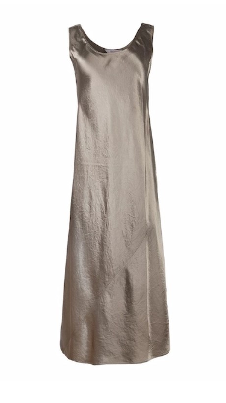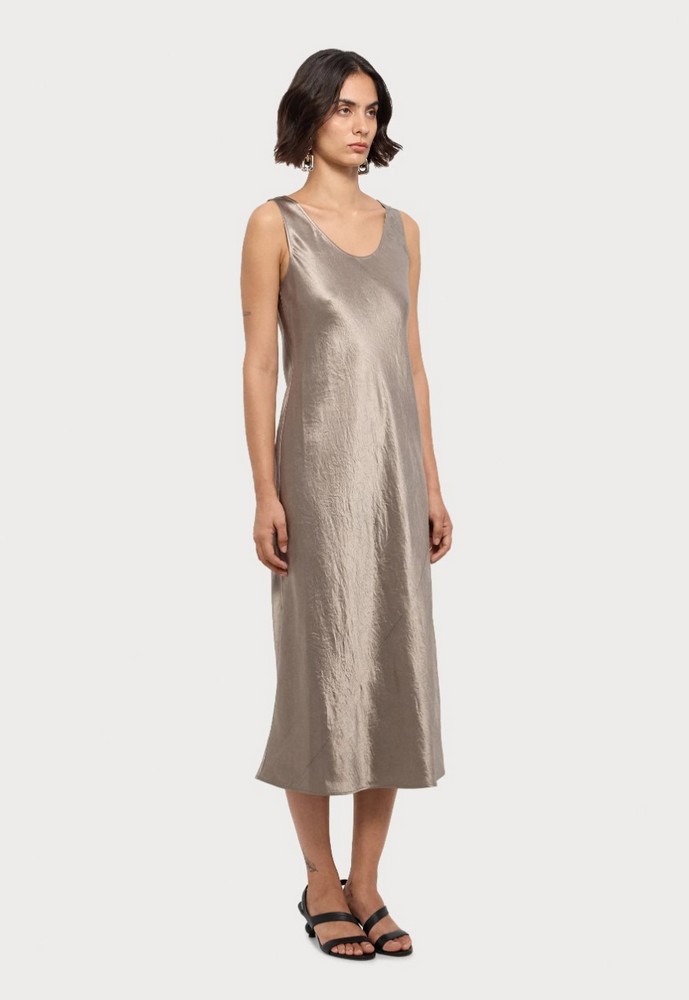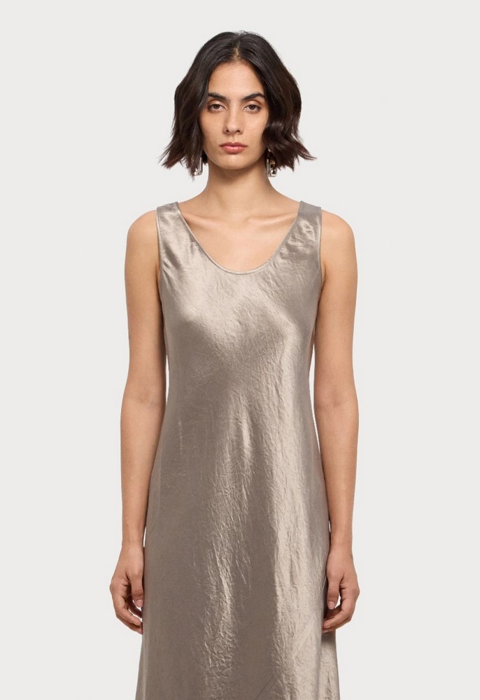 Платье однотонное длинное. Без рукава. Овальный вырез. Приталенный силуэт. Серо-бежевый цвет.