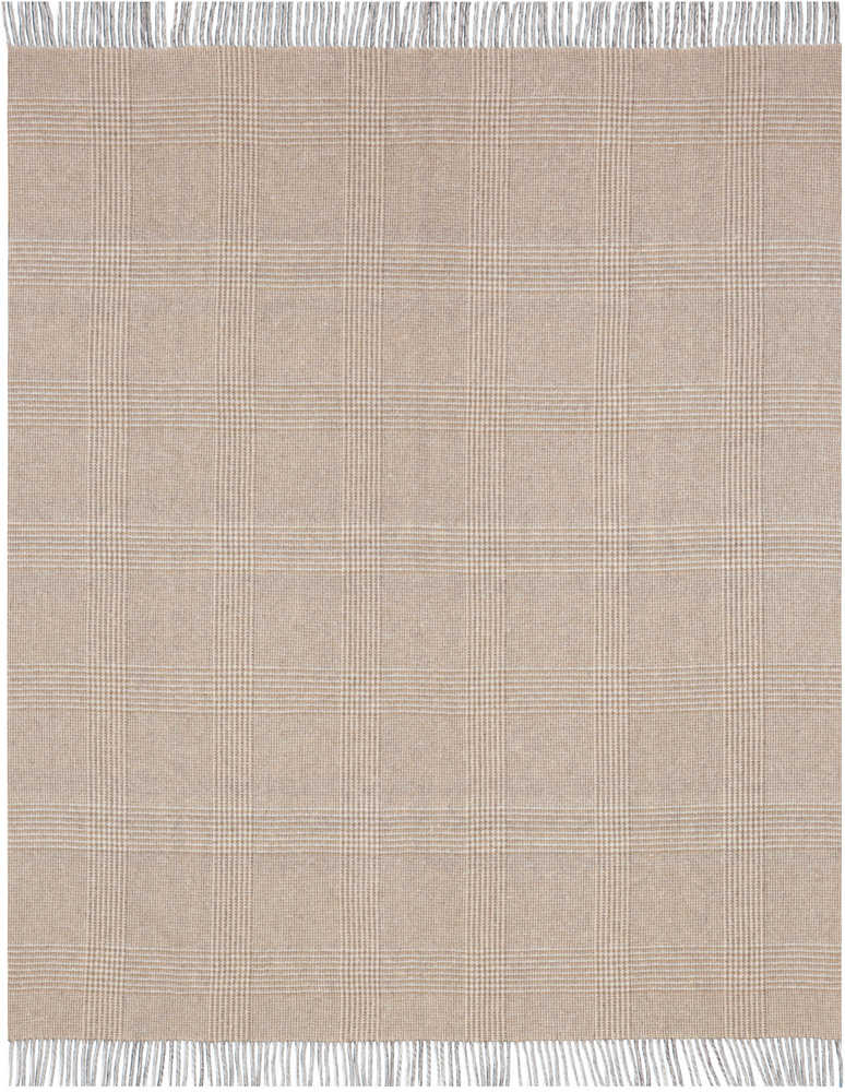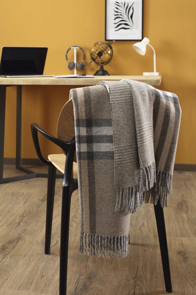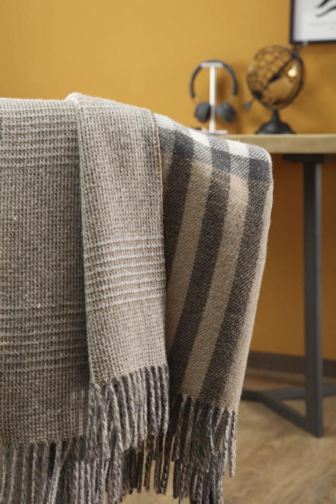 Это двусторонняя клетка с классическим рисунком бежево-черного цвета с одной стороны и изящной, едва заметной клеткой с другой стороны. Пестрая бахрома дополняет необычный вид и делает шерстяной плед элегантным и привлекательным украшением.