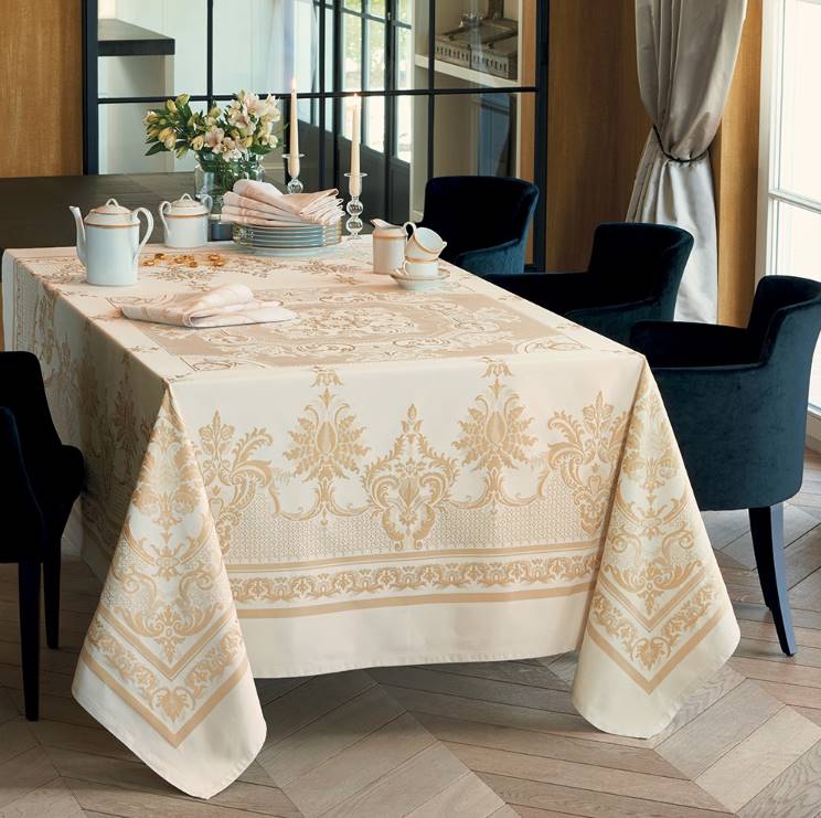 Премиальная Скатерть Garnier-Thiebaut ELEONORE GOLD диаметр 245 артикул 79837 купить с доставкой в Москве, цены - интернет-магазин по продаже скатертей №1 в России