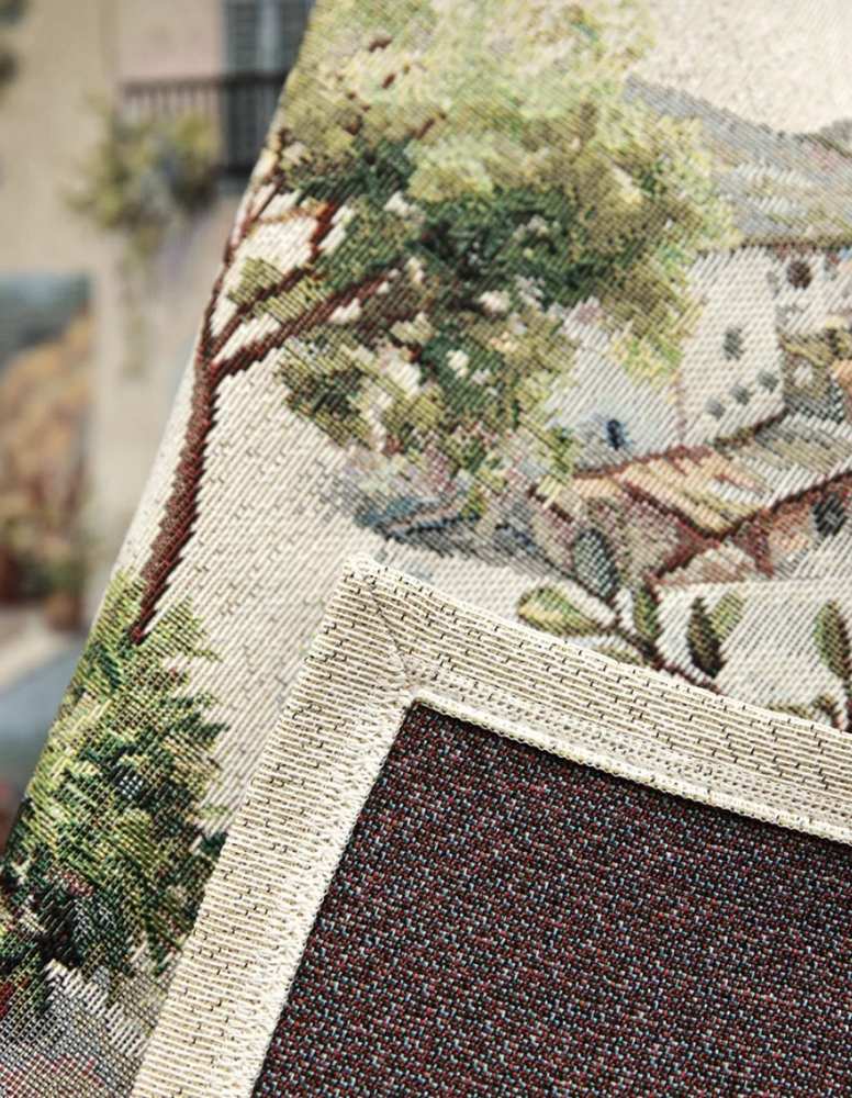 Рисунок создается переплетением нитей различных цветов и фактуры. Состав ткани: хлопок (дающий фактуру и приятную тактильность) и синтетические нити (придающие износостойкость). Плотность гобелена 410 г/метр2.