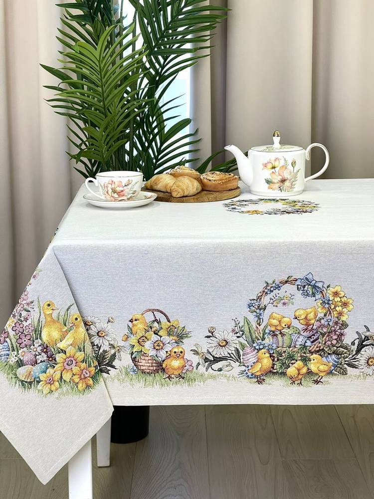 Премиальная Скатерть Le Gobelin ЦЫПЛЯТА И ФИАЛКИ 140х140 артикул 81736 купить с доставкой в Москве, цены - интернет-магазин по продаже скатертей №1 в России