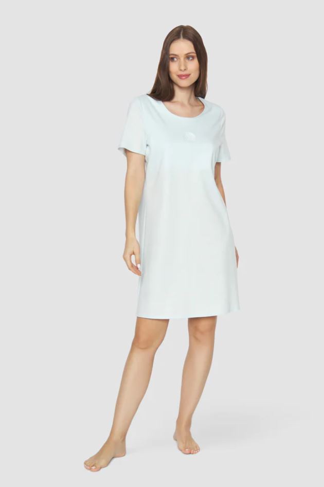 Ночная сорочка, рукава 1/2 и с U-образный вырез. Шелковистый трикотаж светло голубого цвета.