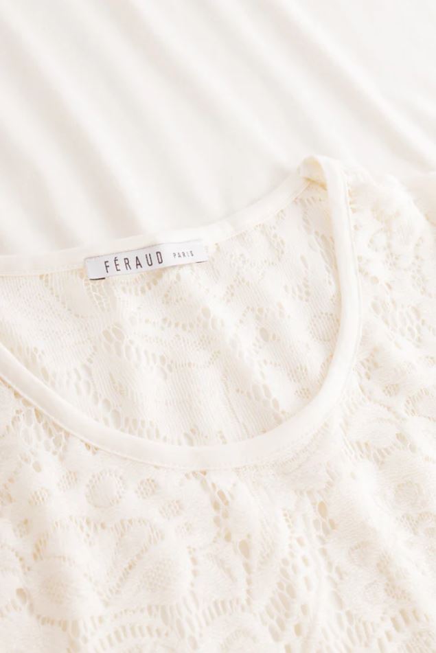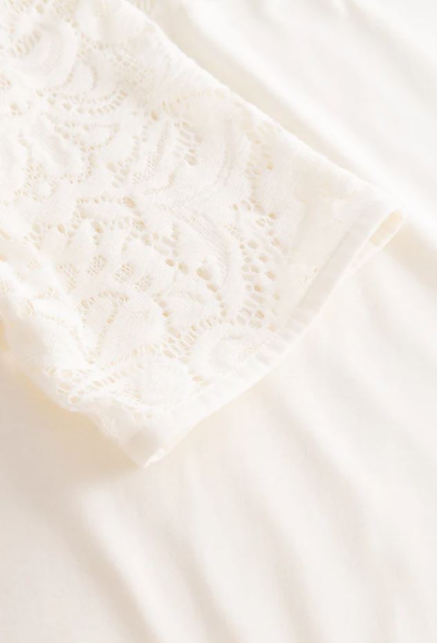 Горловина и окантовка рукавов отделаны кружевом, комфортные разрезы по бокам вницу.