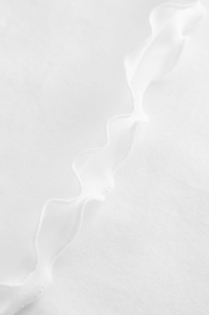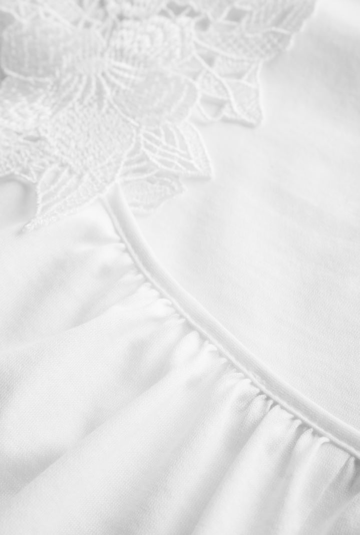 Стильное оригинальное ночное белое платье с заниженной линией плеч, тонкими рюшами и игривым подвернутым краем в современном романтическом образе из тончайшего хлопкового джерси.