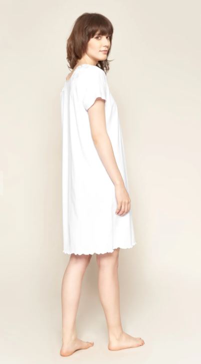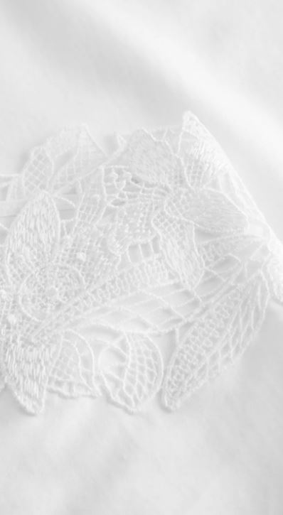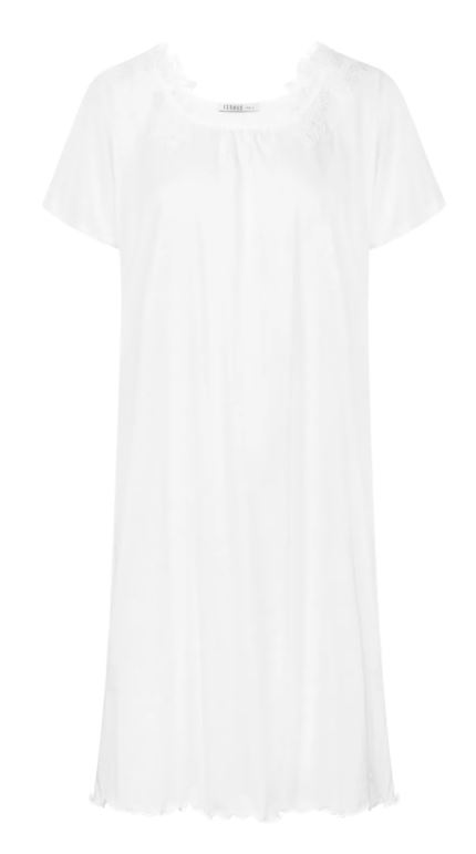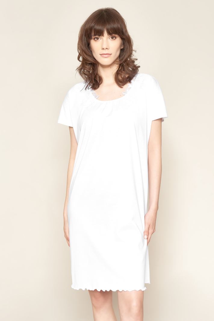 Стильное оригинальное ночное белое платье с заниженной линией плеч, тонкими рюшами и игривым подвернутым краем в современном романтическом образе из тончайшего хлопкового джерси. Высококачественные мотивы вышивки изысканно использованы в качестве привлекательного решения для зоны декольте. Длина сорочки 96 см. Материал: 100% хлопок.
