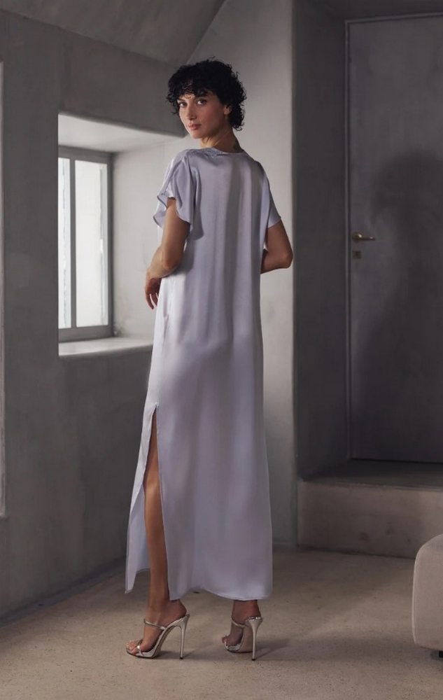 Короткие свободные рукава и боковые разрезы обеспечивают идеальную свободу движений, грациозно дополняя каждое движение. Этот мягкий и современный оттенок, представленный в сияющем стальном синем цвете, подходит любому типу кожи. Branda – это изысканный предмет гардероба и минималистичное платье, которое можно носить по своему вкусу, как в повседневной жизни, так и для особых случаев.