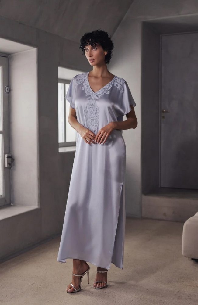Ночная сорочка выполнена из 100% шёлкового атласа. Струящийся крой ласкает тело мягкостью и лёгкостью. V-образный вырез изящно дополнен цветочным кружевом, добавляя нотку романтической утончённости.