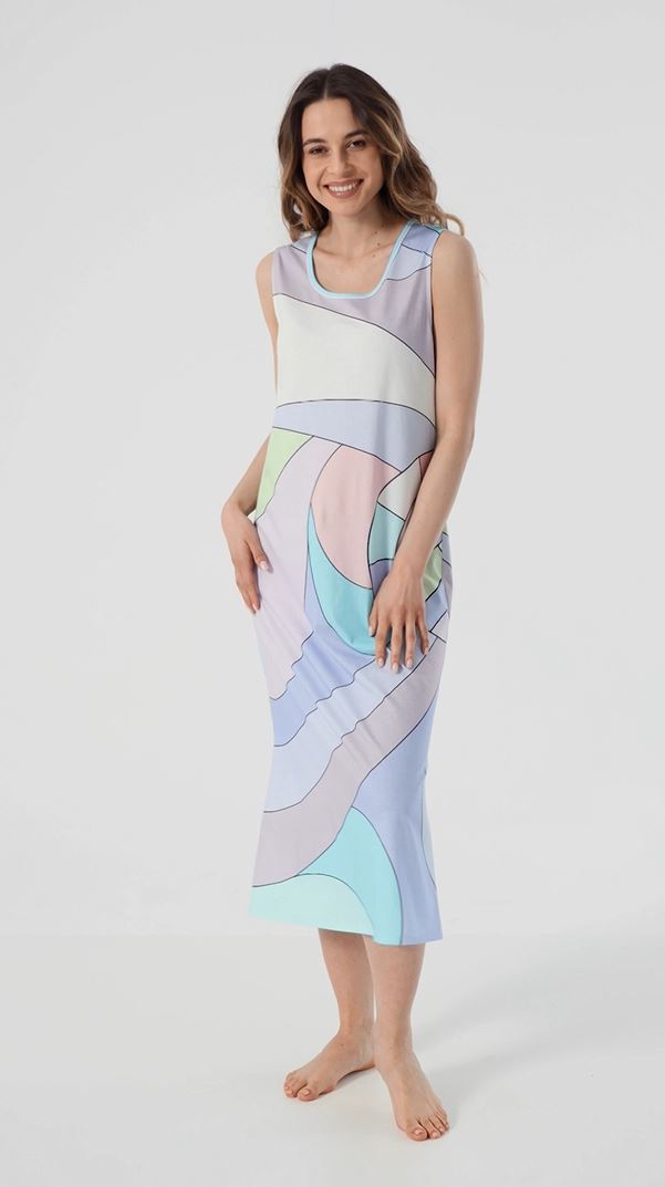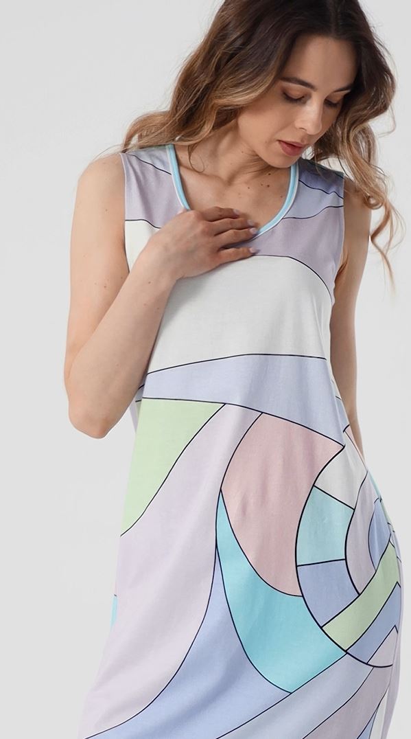 Стильное ночное платье без рукавов с окантовкой на круглом вырезе и оригинальным графическим принтом с декоративным логотипом Feraud.
