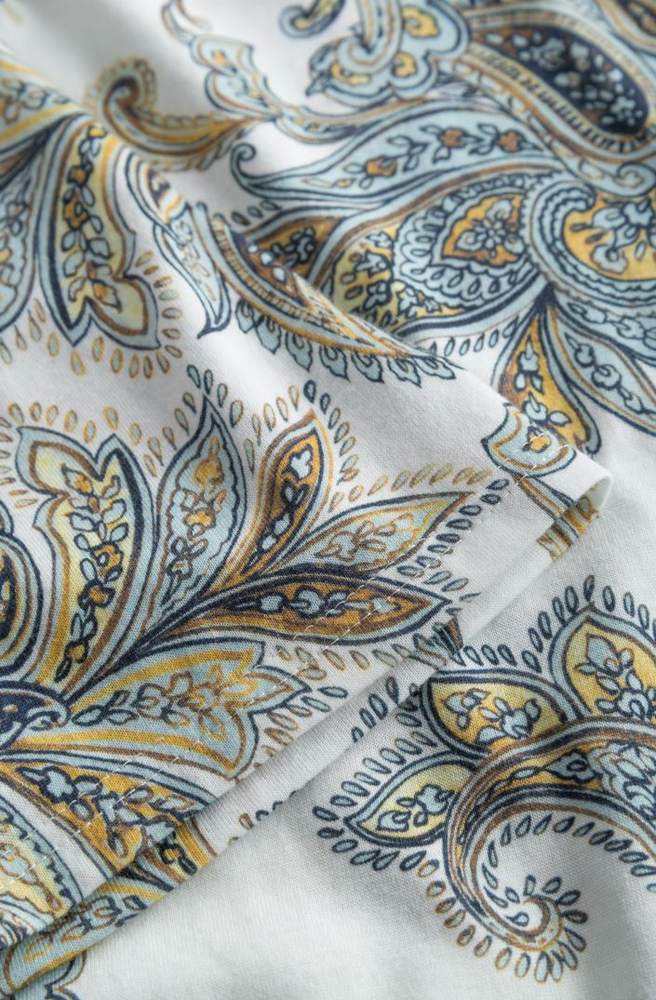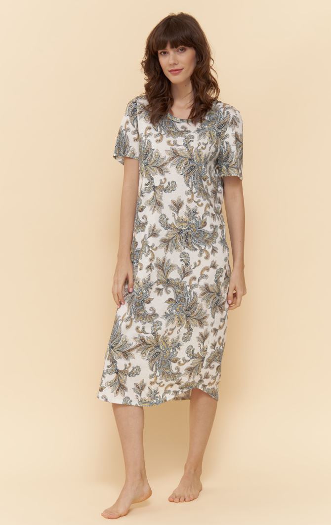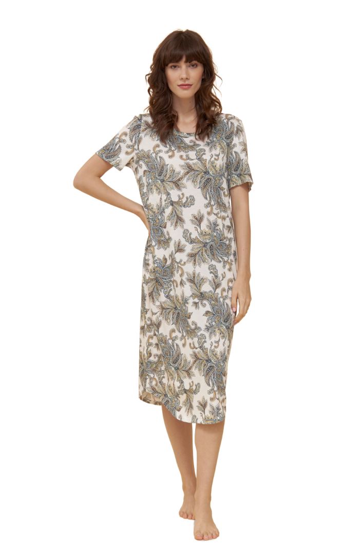 Ночное платье из мягкого трикотажа с набивным рисунком. Круглый вырез ворота окаймлен и обработан узким кантом из однотонной ткани в тон. Подол слегка закруглен. Боковая закругленная кромка, пейсли принт. Длина 110 см.