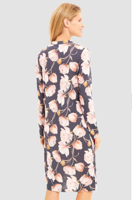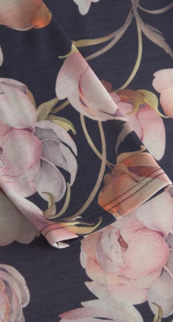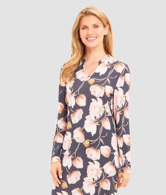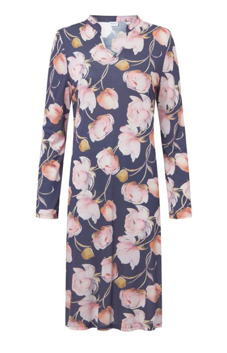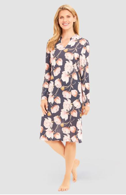 Ночная сорочка с длинным рукавом и с V-образным вырезом с крупными розовыми пионами. Длина 100 см. 100% модал.