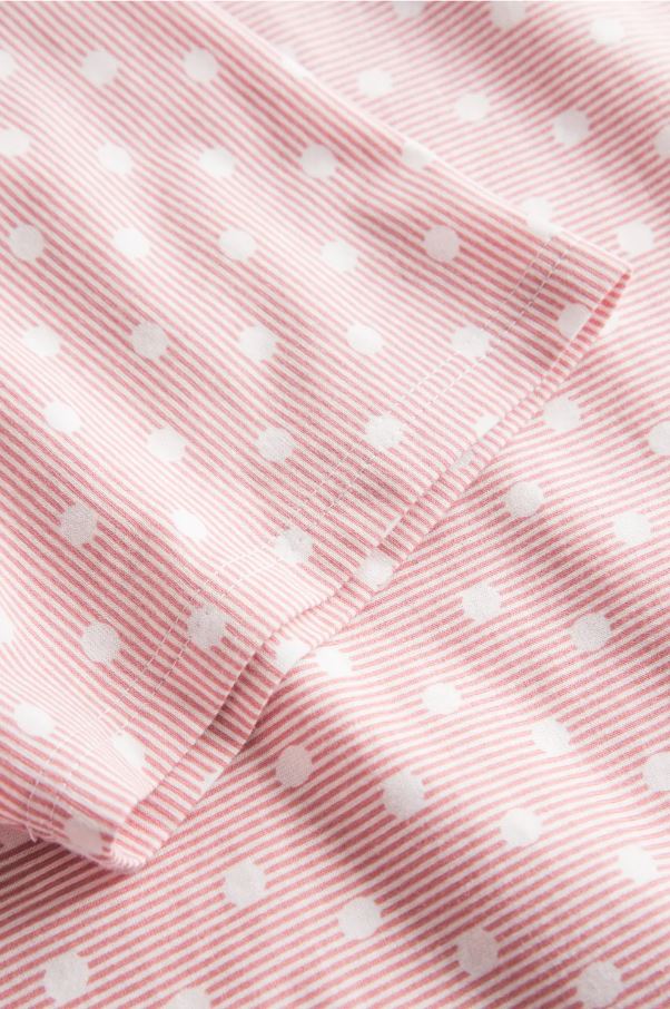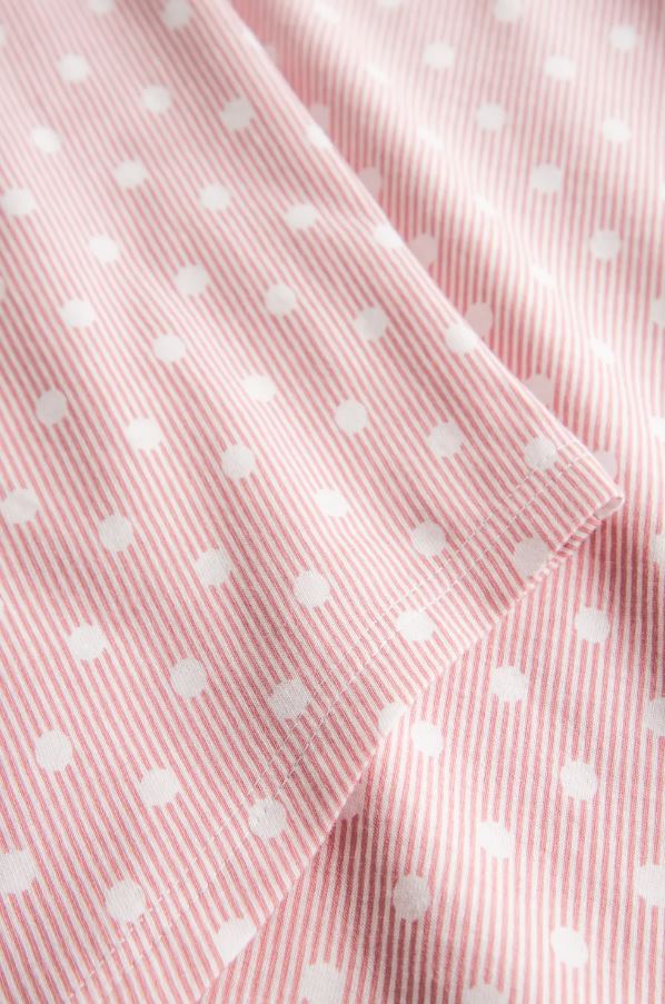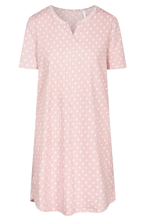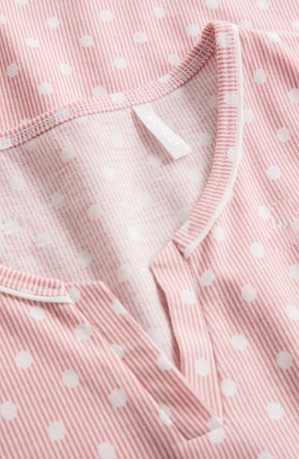 Ночная сорочка с принтом имеет узкую окантовку цвета экрю на вырезе и небольшой разрез на вырезе. Оригинальный принт в горошек и полоски очень тонко напечатан на удобном и мягком хлопке. Закругленный низ создает повседневный образ. Длина 90 см. Сорочка выполнена их 100% хлопка, джерси.