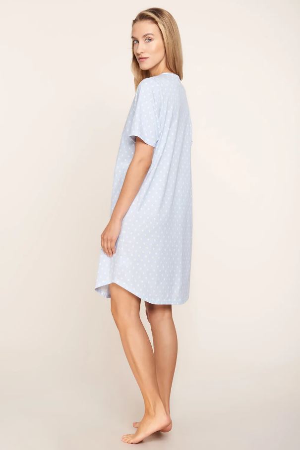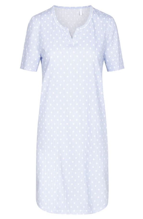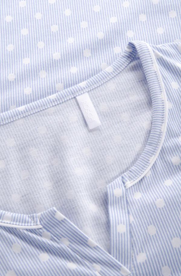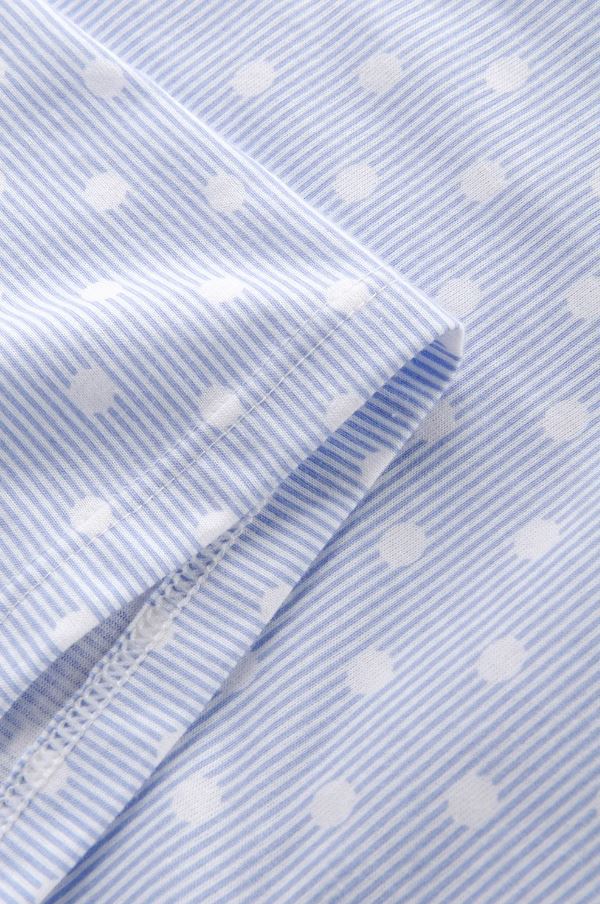 Ночная сорочка с принтом имеет узкую окантовку цвета экрю на вырезе и небольшой разрез на вырезе. Оригинальный принт в горошек и полоски очень тонко напечатан на удобном и мягком хлопке. Закругленный низ создает повседневный образ.
