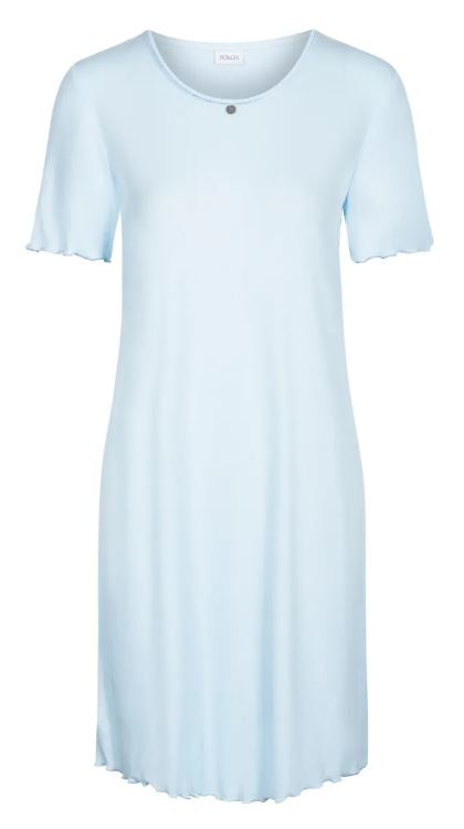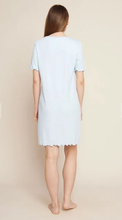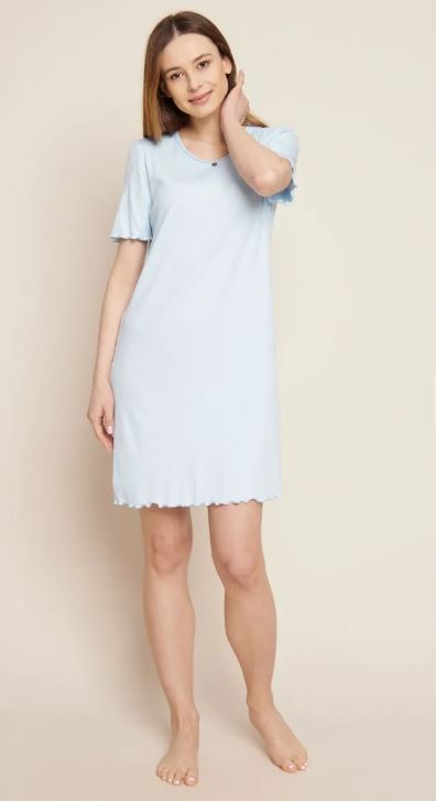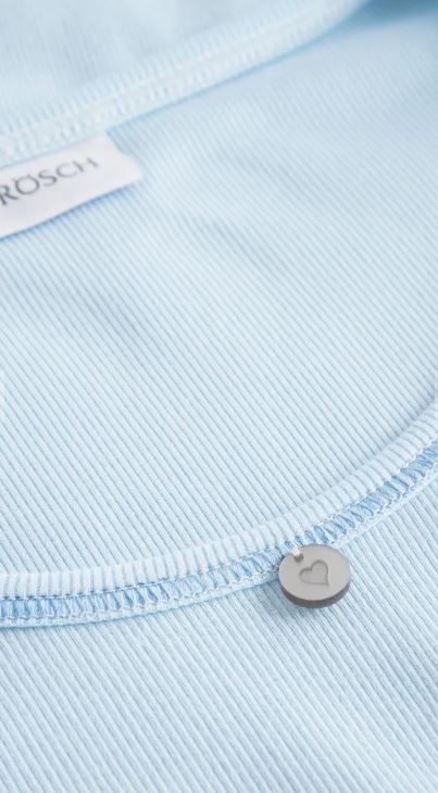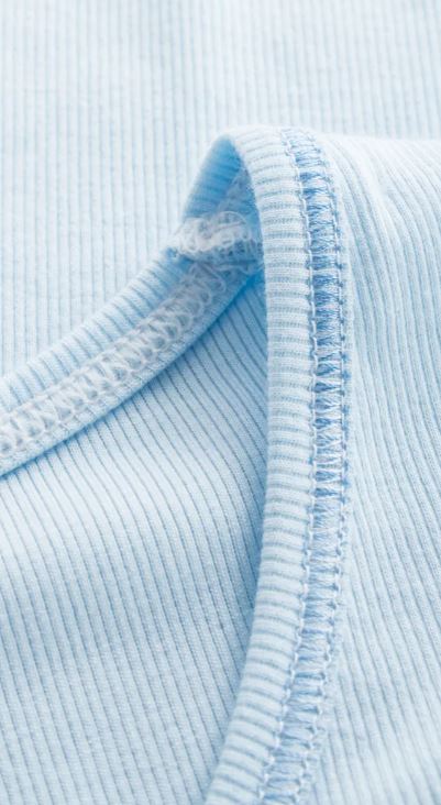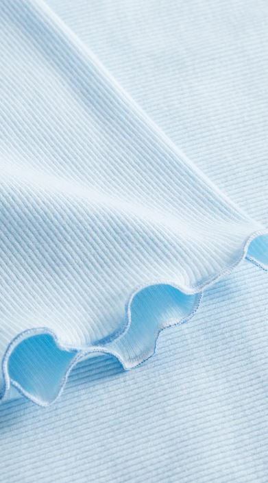 Однотонная рубашка из качественного трикотажа в рубчик с фестонными швами из смеси материалов голубого цвета. Декоративная деталь на декольте.