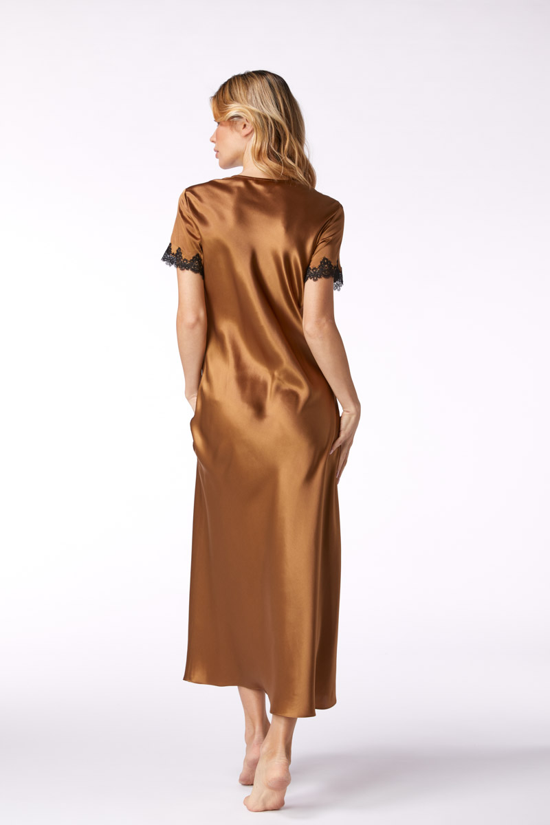 Вырез и края коротких рукавов длинной шелковой ночной сорочки отделаны кружевом.
