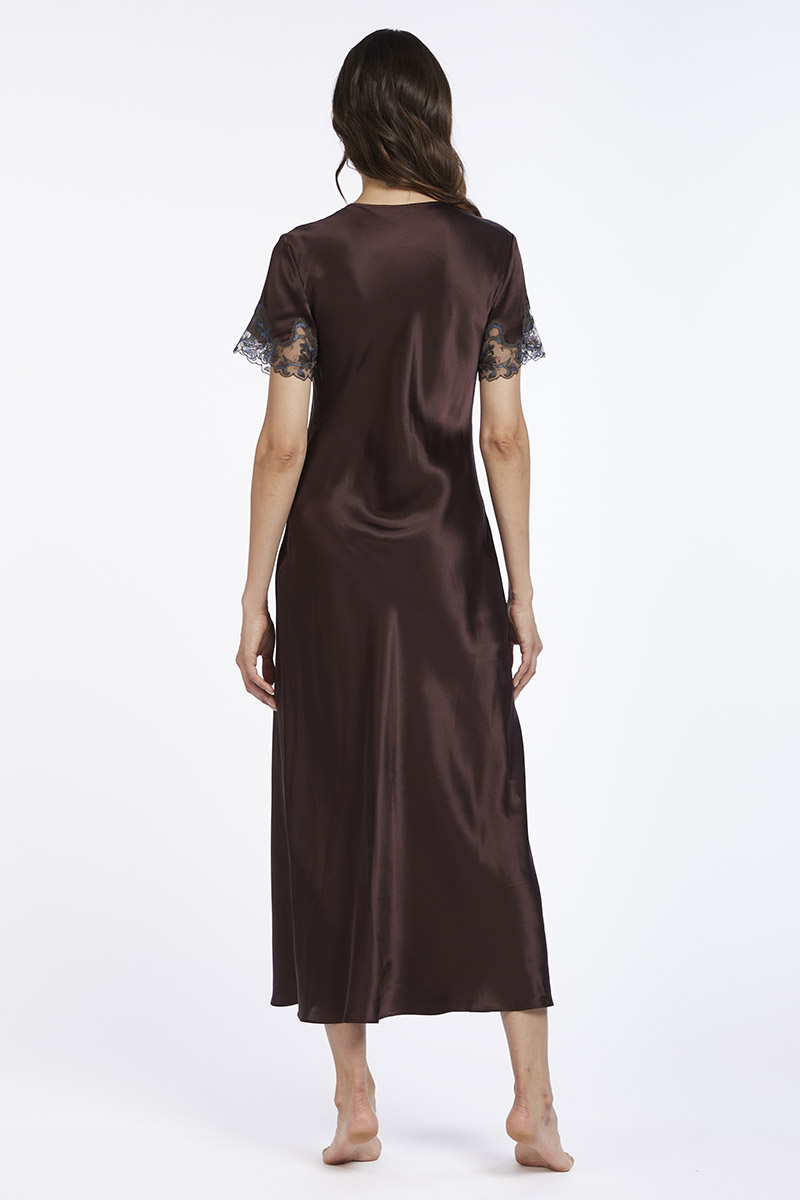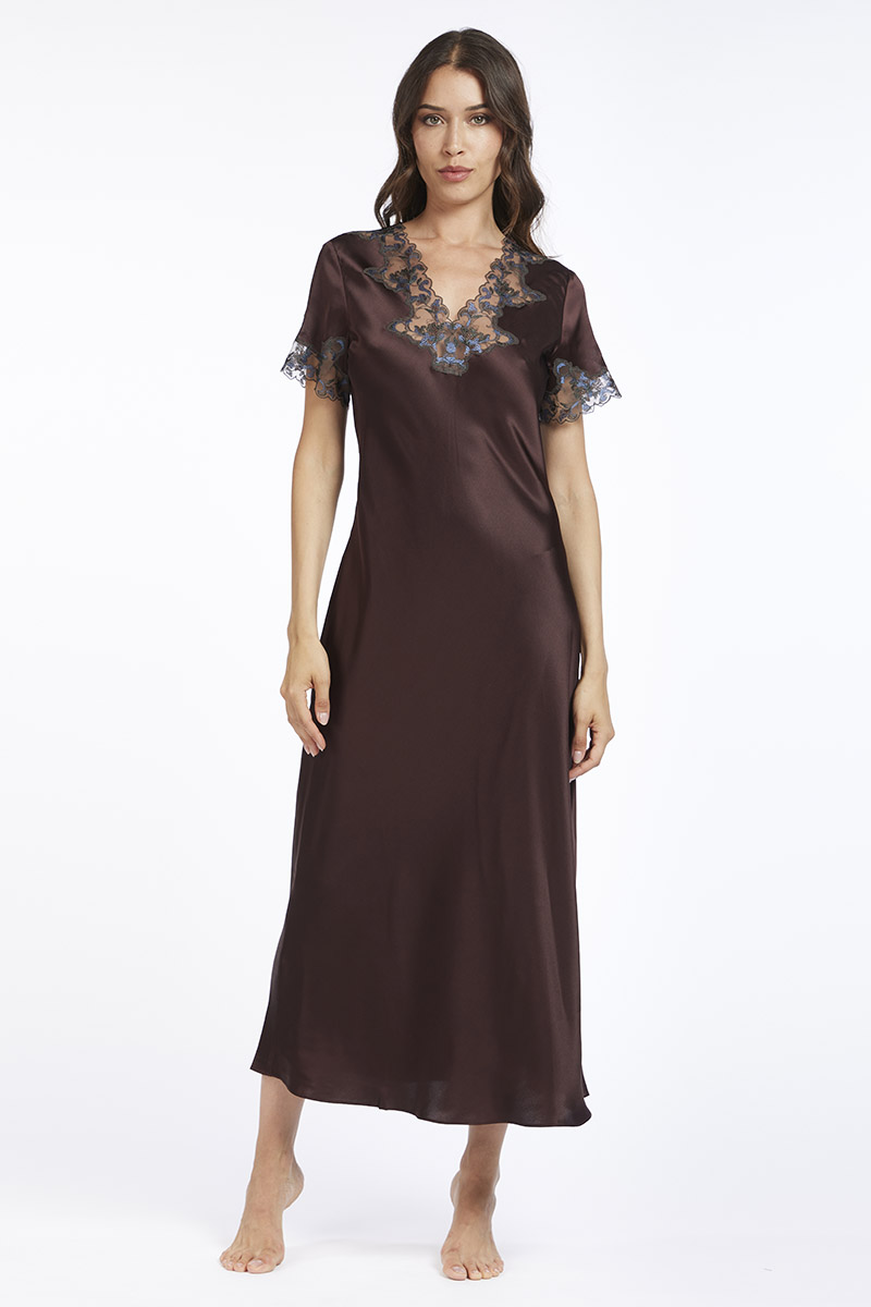 Изысканная ночная рубашка из 100% шелкового атласа, украшенная нежной кружевной аппликацией.