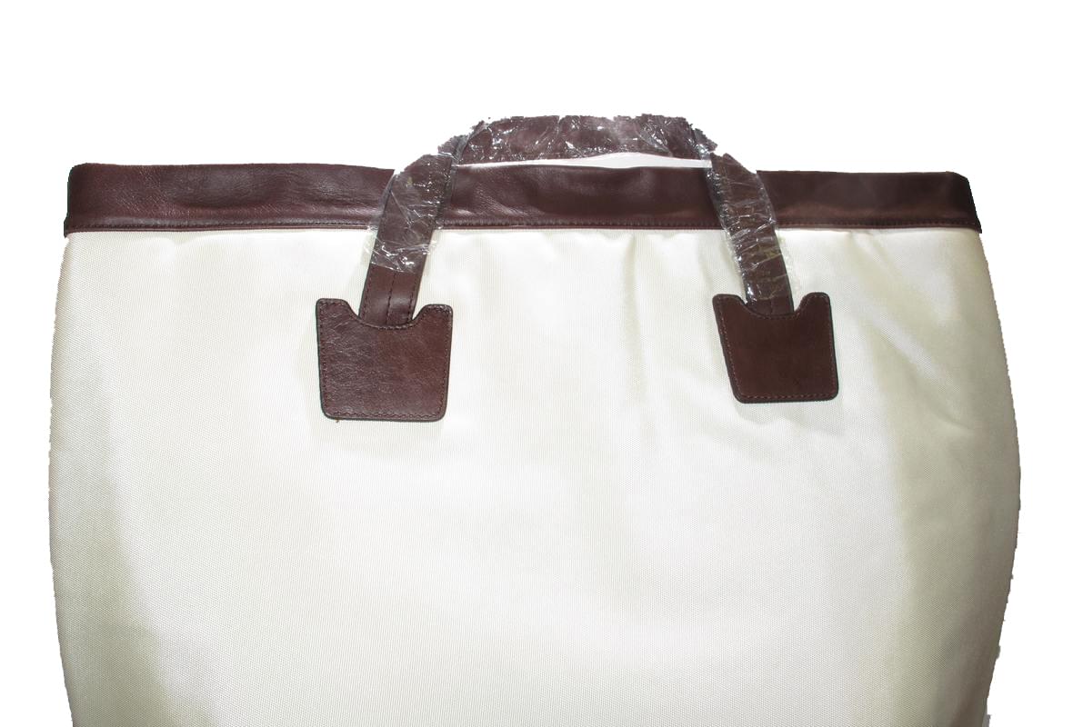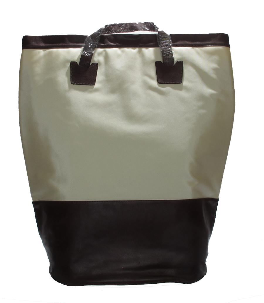 Удобная большая сумка для использованного белья, верх плотный синтетический материал кремового цвета - нейлон, ручки, ободок сверху и нижняя часть сумки натуральная коричневая кожа. В нижней части металлические ножки. Удобна в обслуживании.