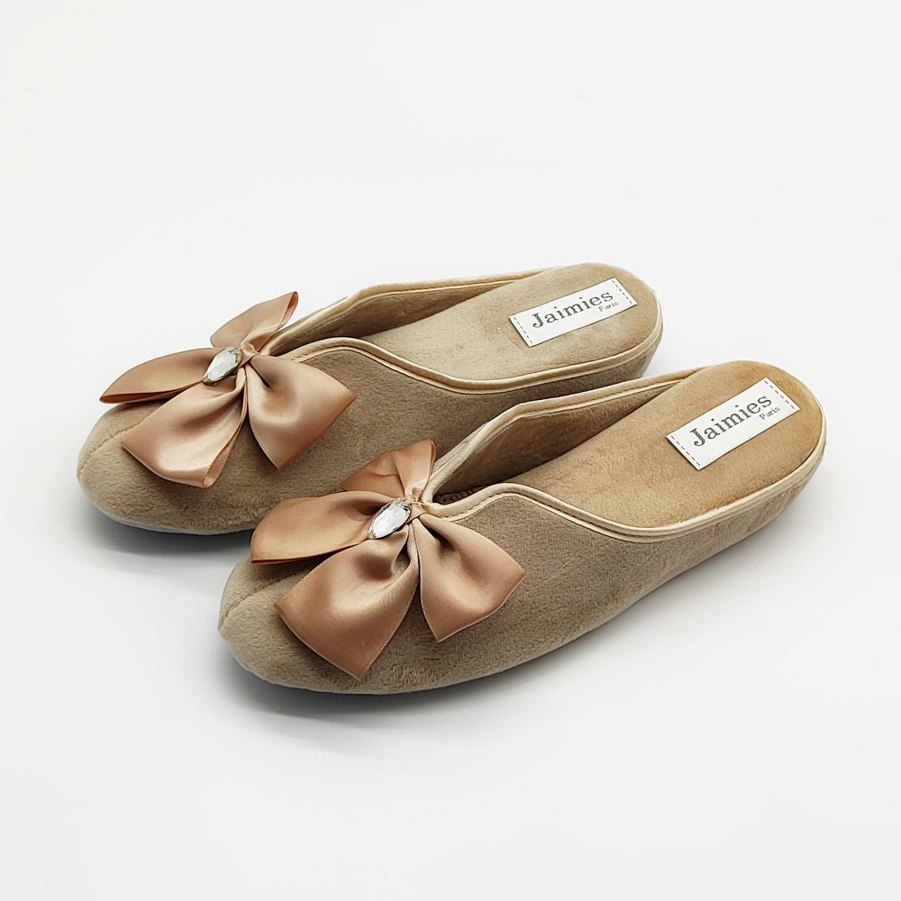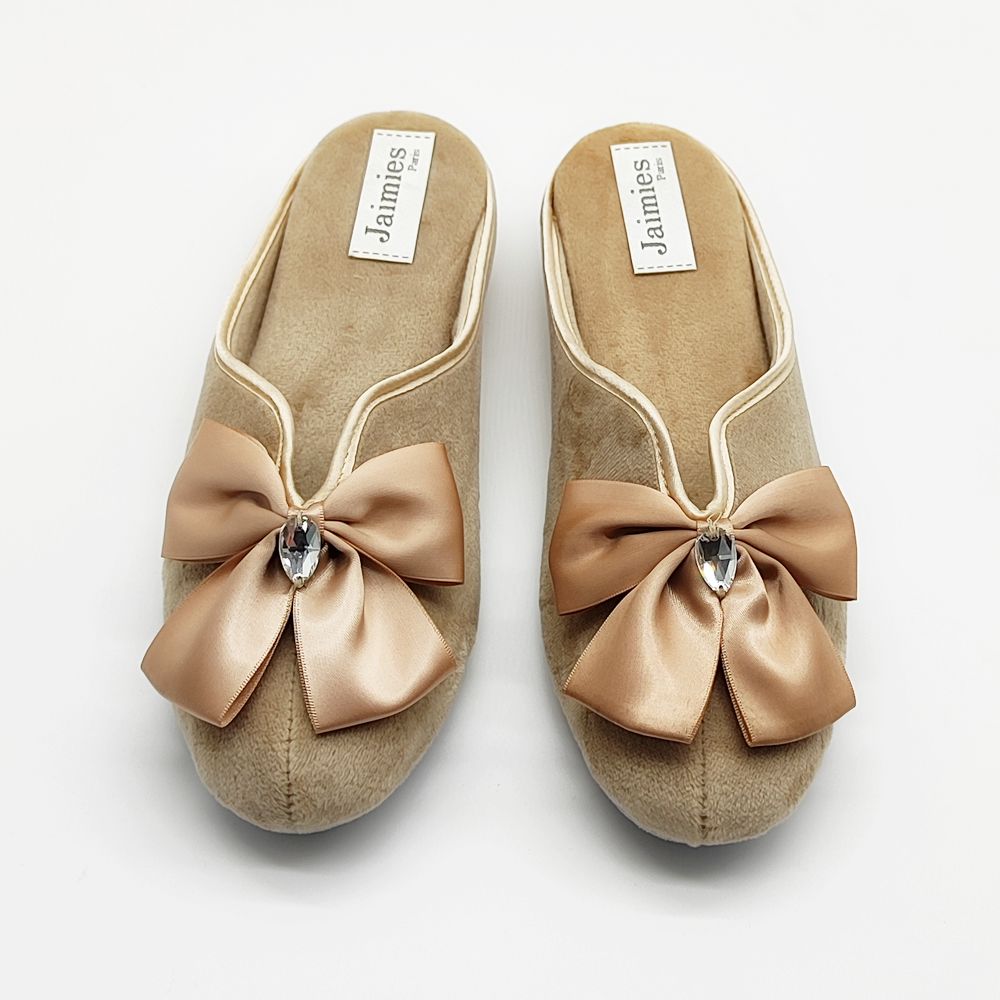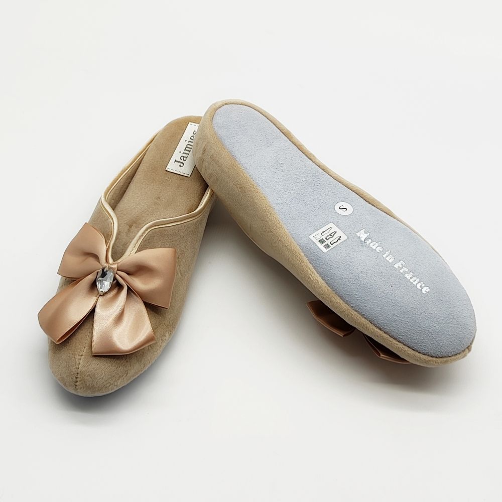 Женские домашние тапочки должны быть удобными и стильными — такими, как модель NATHALIE mule DIAMS французского бренда Jaimies. Эту обувь можно назвать воплощением женственности: нежнейший бежевый цвет, прелестные банты. Тапочки на небольшой платформе изготовлены из практичного высококачественного велюра, подошва — из замши. Такую модель можно приобрести и в подарок: эксклюзивные домашние тапочки в течение многих лет будут радовать свою владелицу безупречным внешним видом и удобством.