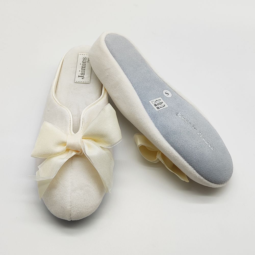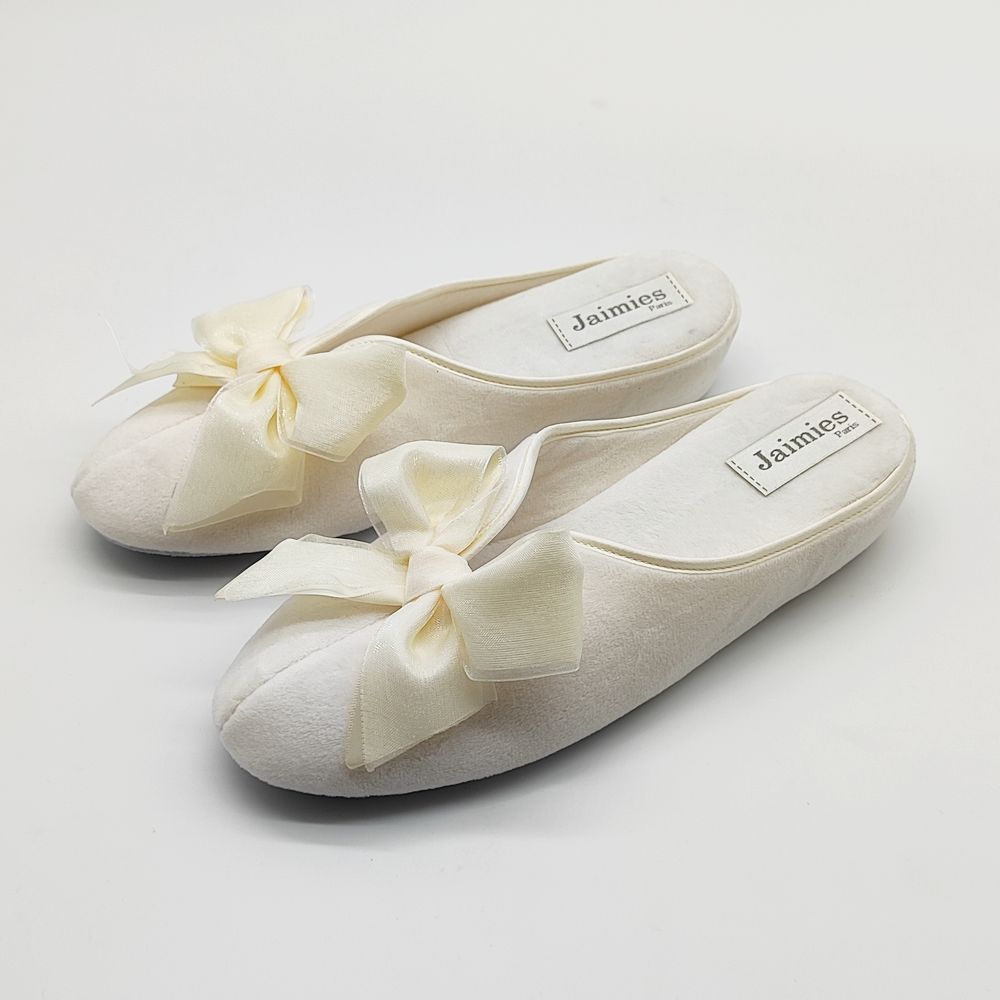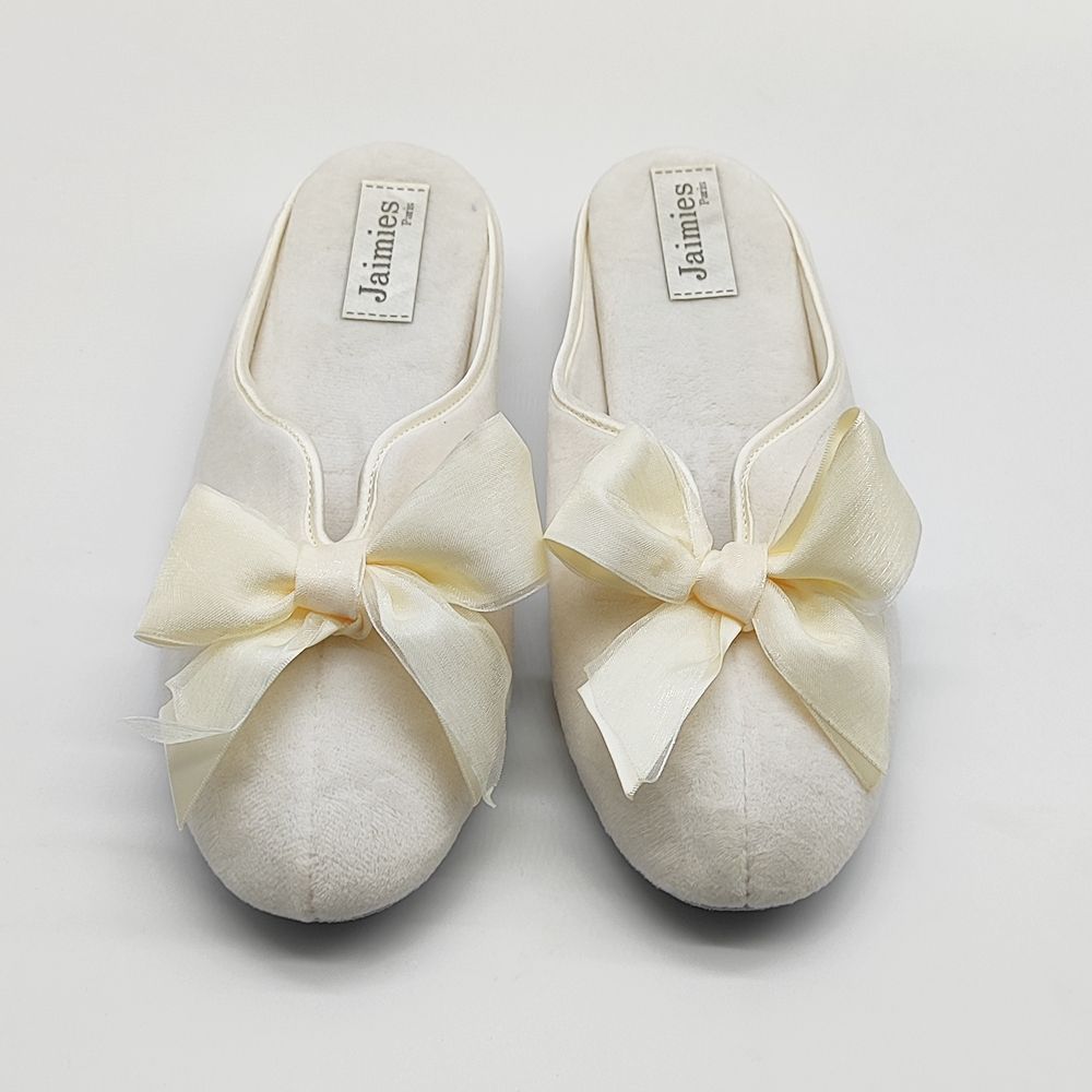 Женские домашние тапочки должны быть удобными и стильными — такими, как модель NATHALIE mule nina французского бренда Jaimies. Эту обувь можно назвать воплощением женственности: нежнейший молочный цвет, прелестные банты. Тапочки на небольшой платформе изготовлены из практичного высококачественного велюра, подошва — из замши. Такую модель можно приобрести и в подарок: эксклюзивные домашние тапочки в течение многих лет будут радовать свою владелицу безупречным внешним видом и удобством.